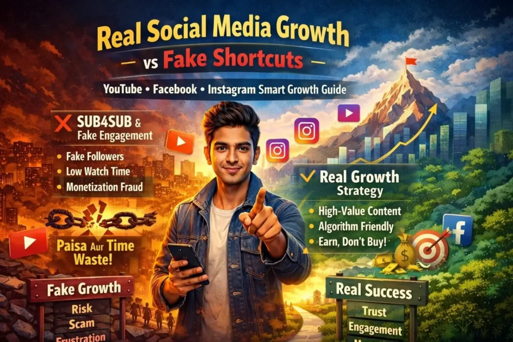 YouTube, Facebook & Instagram Par Smart Growth Guide Aaj kal har creator ka ek hi dream hota hai — views badhe, followers grow kare, aur monetization unlock ho jaye. Lekin problem ye hai ki majority log fast growth ke chakkar me galat shortcuts use karne lagte hain — jaise Sub4Sub, fake engagement, bot followers, aur